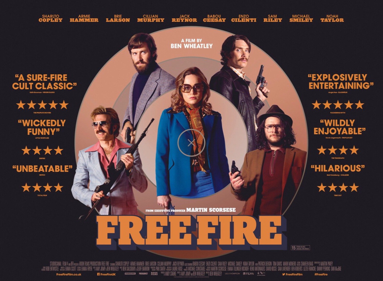 Clearly Free Fire is not going to be everyone’s cup of tea but imagine the shoot out from Heat, staged in the warehouse from Reservoir Dogs with the cast of A Fish Called Wanda. If that sounds like something you could enjoy then head along to see it. The cast are all excellent and play everything with a really dry wit. Free Fire is not a broad comedy but it is blackly amusing and some of the characterisations are just the right side of caricature. Sharlto Copley undoubtedly has the biggest personality as extravagant arms dealer Vernon but even though they appear to playing it straighter both Armie Hammer and Babou Ceesay essay very different but equally subtle parodies of the gentleman killer. Jack Reynor is also really strong as the impetuous and stubborn guy that might have kicked the whole thing off. On the other side of the deal gone sour you have Sam Riley, Cillian Murphy and Michael Smiley, each immensely entertaining as a gang with less decorum but a greater sense of honour. The way all these gangsters play off one another, with shaky loyalties and uncertain motives, is great fun. The insults and jibes fly around the room as much as the bullets and it makes for an exhilarating and highly entertaining ninety minutes.