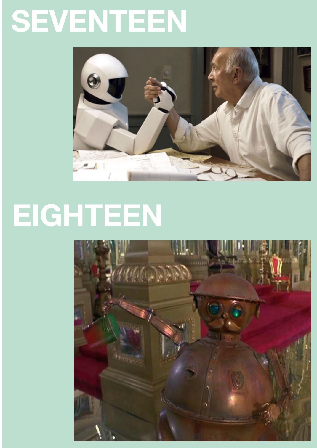 Top 20 Movie Robots Ranked March 26, 2017 • notlefthandedfilmguy Share this: Click to share on Facebook (Opens in new window) Facebook Click to share on X (Opens in new window) X Click to email a link to a friend (Opens in new window) Email Click to share on Tumblr (Opens in new window) Tumblr Click to share on Pinterest (Opens in new window) Pinterest More Click to share on WhatsApp (Opens in new window) WhatsApp Like Loading...
