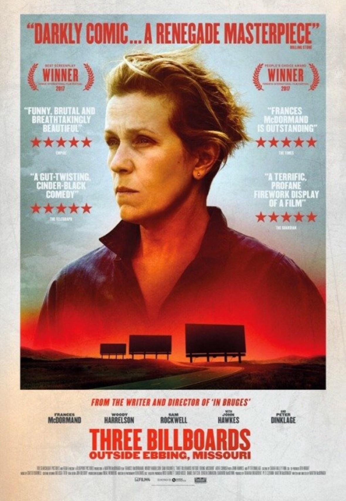 When writing about Armando Iannucci’s black comedy The Death of Stalin I discussed how for me the upsetting content of the film had totally eclipsed the humour. It was, I said, a comedy that had actively stopped me laughing. In trying to demonstrate how this wasn’t just my failure to respond to this type of movie I cited Martin McDonagh’s In Bruge as an example of a darkly comedic film that I had enjoyed. Here we are with McDonagh’s latest feature though and once again I just could get past the black enough to appreciate the comedy. Three Billboards Outside Ebbing, Missouri is a clever, well written and magnificently performed movie but it just brought me down to a point where any level of proper joviality was never going to happen. The film is just soul destroying and watching it hurts. I felt as though a hand had tightened around my heart within the first ten minutes and the grip did not subsequently let up. This in itself is not a problem, there have been plenty of sad films that I have found beautifully cathartic; Dancer in the Dark, The Florida Project, Pan’s Labyrinth, but if you don’t respond to the humour in Three Billboards Outside Ebbing, Missouri then it offers very little release and it has absolutely no closure.