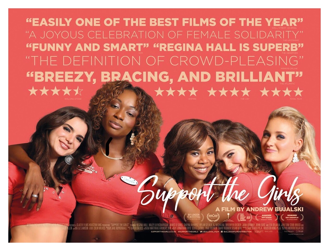 Support the Girls is a film all about female companionship. Of course, while this is still a relatively rare thing, it is not a great novelty with many other well known movies having a similar focus. If you look at the majority of these though they all play out in specifically female orientated space. Consider Steel Magnolias, Beeches, Bridesmaids, Girls Trip, Sex and the City, Fried Green Tomatoes at the Whistle Stop Cafe, Mystic Pizza or Waiting to Exhale and you’ll notice that these films are set in places like cafes, salons, homes, holidays and weddings. There are also those that challenge convention by putting women in typically male dominated scenarios such as armed robbery in Thelma & Louise and Set It Off, baseball in A League of Their Own, heists in Ocean’s 8 and Widows and ghostbusting In Ghostbusters. Support the Girls does something different though by setting its story in a place that is demonstrably a man’s world but one that has a dominant female presence. Support the Girls centres around a bawdy sports bar staffed by scantily clad waitresses and by concentrating on the ladies in this setting, the film examines the challenging dichotomy of an environment that belongs equally to both genders but in very different ways.