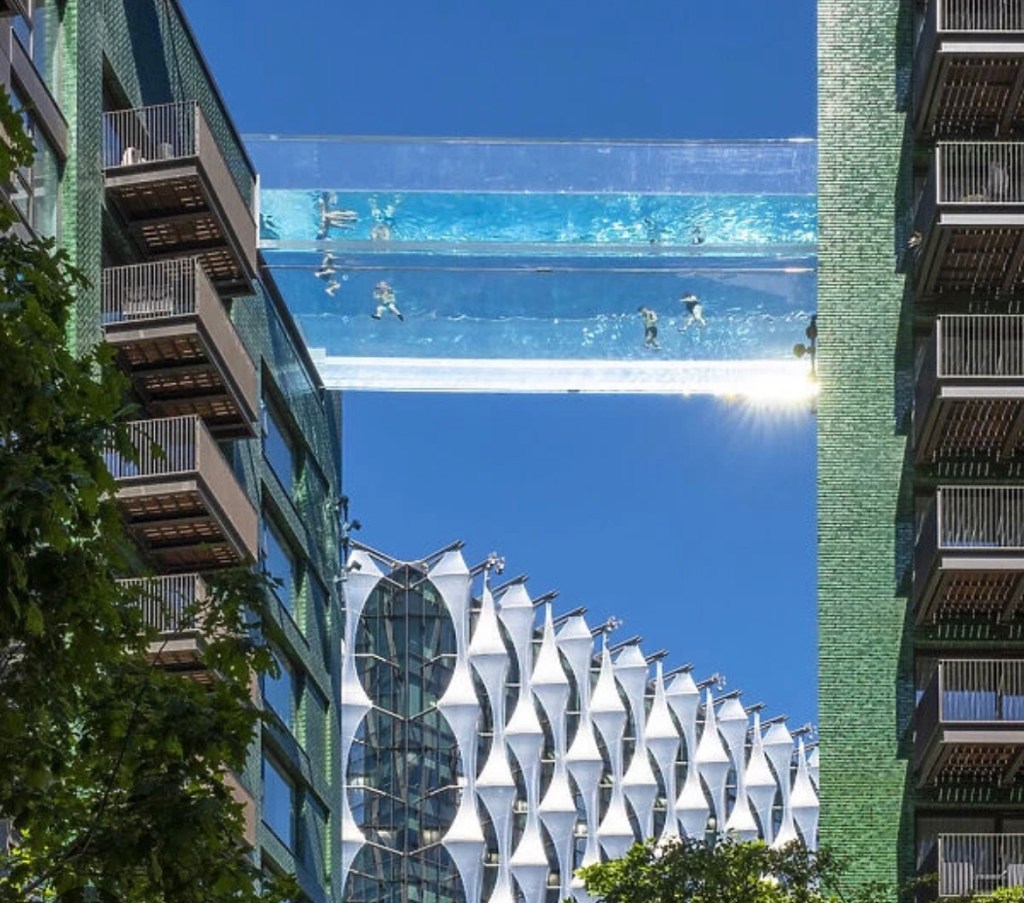 If you travel on the train into Waterloo Station, just before you pass through Vauxhall, you might notice a clear swimming pool suspended ten stories up between two apartments blocks. It’s just on the north side of the tracks near the Power Station. Made entirely of reinforced acrylic, it is the 14 metre middle section of a full 25 metre stretch that bridges the two buildings with the impressive transparent construction allowing swimmers to see right through to the ground below. Diving in has got to be a rush. It’s been there since May 2021 and I must have seen it hundreds of times on my journeys in and out of the capital,